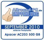 Mit der AC203 bringt Apacer eine weitere externe 2,5“ Festplatte auf den Markt, die sich durchaus sehen lassen kann. Die Verarbeitung ist gut und die drei verschiedenen Farbtypen sind alle recht schlicht und seriös gehalten. Die in unserem Test ermitte...